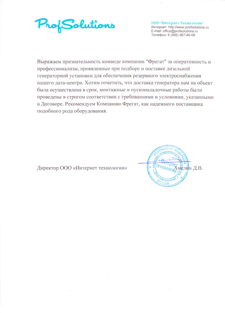 Выражаем признательность компании "Фрегат" за оперативность и профессионализм, проявленные при подборе и поставке дизельной генераторной установки для обеспечения резервного электроснабжения нашего дата-центра. Хотим отметить, что доставка генератора нам на объект была осуществлена в срок, монтажные и пуско-наладочные работы были проведены в строгом соответствии с требованиями и условиями, указанными в Договоре. Рекомендуем компанию "Фрегат", как надёжного поставщика подобного оборудования.