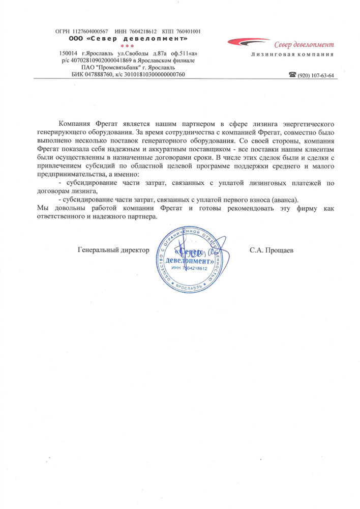 Компания Фрегат является нашим партнером в сфере лизинга энергетического генерирующего оборудования. За время сотрудничества с компанией Фрегат, совместно было выполнено несколько поставок генераторного оборудования. Со своей стороны, компания Фрегат показала себя надежным и аккуратным поставщиком - все поставки нашим клиентам были осуществленны в назначенные договорами сроки. В числе этих сделок были и сделки с привлечением субсидий по областной целевой программе поддержки среднего и малого предпринимательства, а именно: - субсидирование части затрат, связанных с уплатой лизинговых платежей по договорам лизинга, - субсидирование части затрат, связанных с уплатой первого взноса (аванса). Мы довольны работой компании Фрегат и готовы рекомендовать эту фирму как ответственного и надежного партнера.
