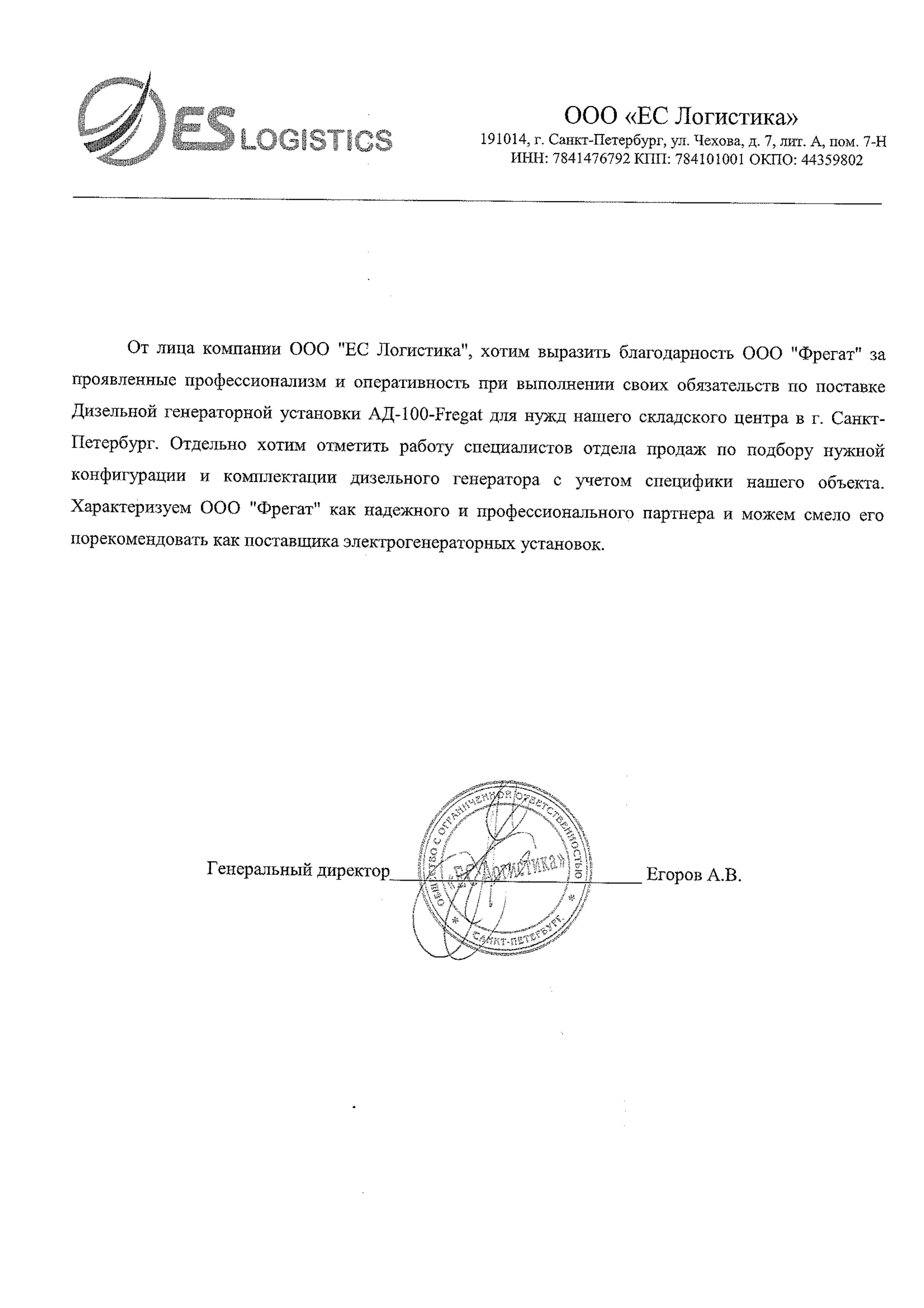 От лица компании ООО "ЕС Логистика", хотим выразить благодарность ООО "Фрегат" за проявленные профессионализм и оперативность при выполнении своих обязательств по поставке Дизельной генераторной установки АД-100-Fregat для нужд нашего складского центра в г. Санкт-Петербург. Отдельно хотим отметить работу специалистов отдела продаж по подбору нужной конфигурации и комплектации дизельного генератора с учетом специфики нашего объекта. Характеризуем ООО "Фрегат" как надежного и профессионального партнера и можем смело его порекомендовать как поставщика электрогенераторных установок.